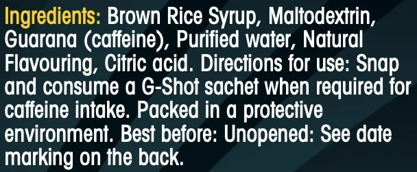 Suggested usage would be 1 G-Shot every 45-60 minutes during an event (or as required).