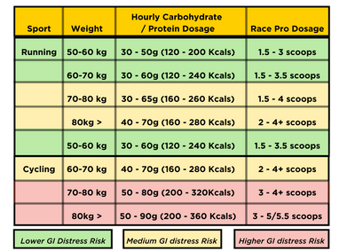 STANDARD SERVING SIZE - Mix 4 scoops of Race Pro with 650 - 750 ml water (56 g Carbohydrates + 8.7 g Protein).